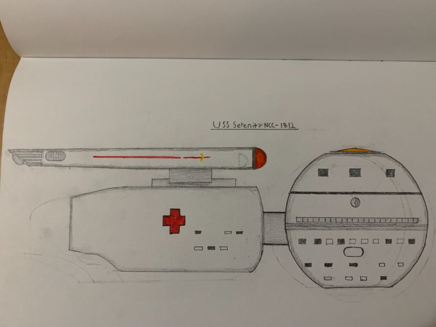 This is medical ship is the U.S.S. Serenity, NCC-1812. It has a cruising speed of Warp 6 Emergency and Warp 8. Crew space: 260 (255 crew, 5 bridge crew/officers) Patient capacity: 2,100.