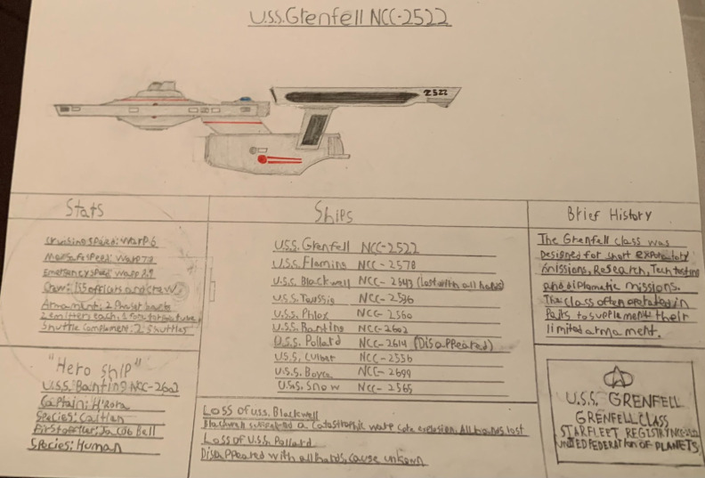 The Grenfell class was designed for Short exploratory missions, Research missions, Second contact missions, Testing new technologies and Diplomatic missions. The class often operated in pairs to supplement their small armament. All Ships of the class were named after doctors, From real life and Star Trek. Here are the stats:
